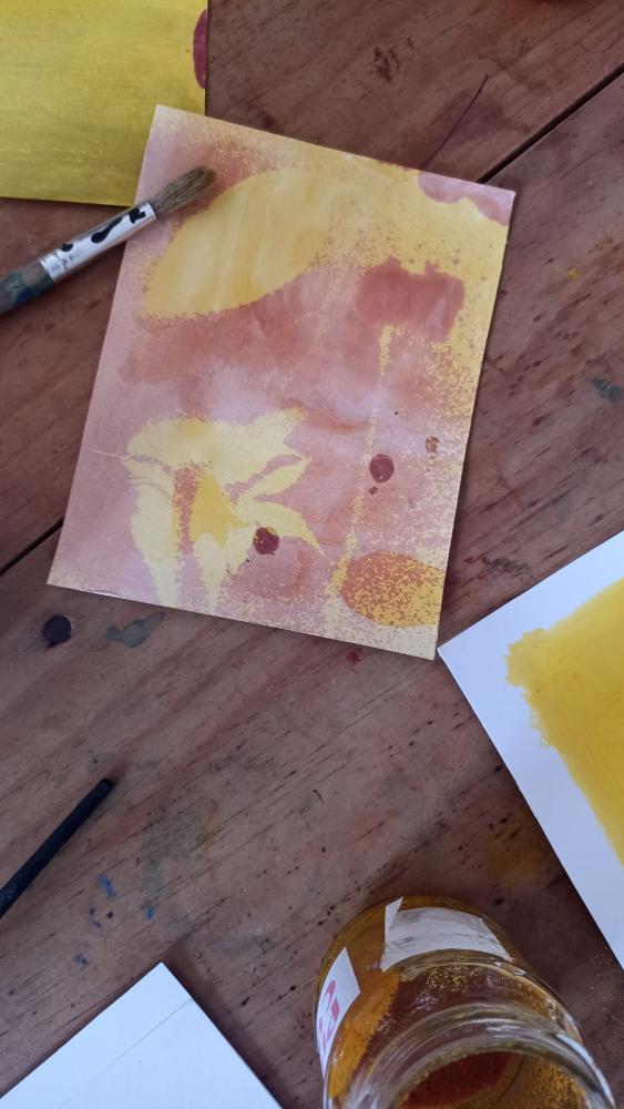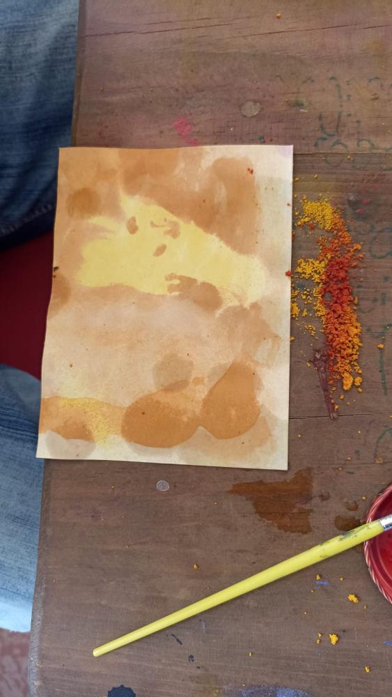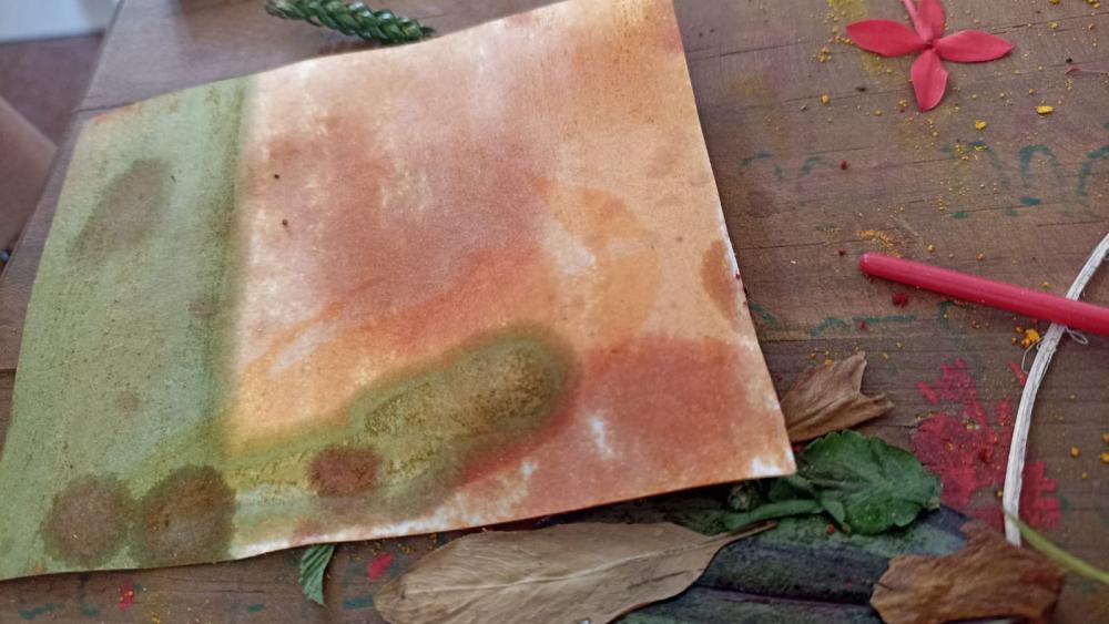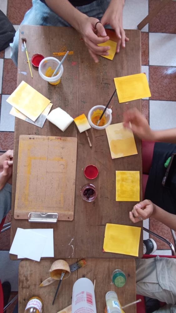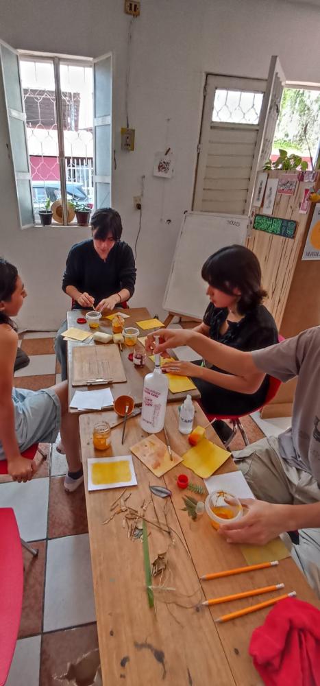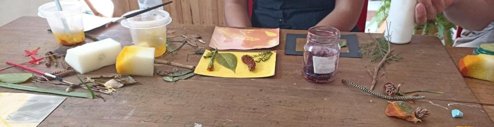 Materiales: Polvo de cúrcuma, flores de jamaica secas, pinceles, esponjas, vasos transparentes para revolver, palos para mezclar y triturar, alcohol etílico, tabla de madera, vidrio o portaretratos, pinzas, marcos de cartulina, fichas de papel, pegamento blanco, bicarbonato, ramas y hojas, y una mesa de trabajo (otros materiales se pueden sumar al momento del taller).