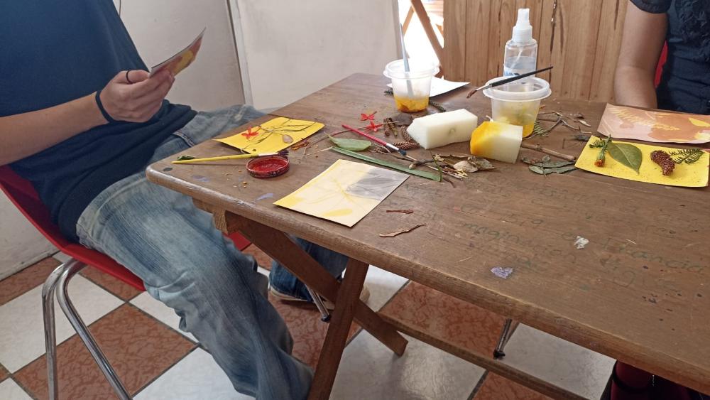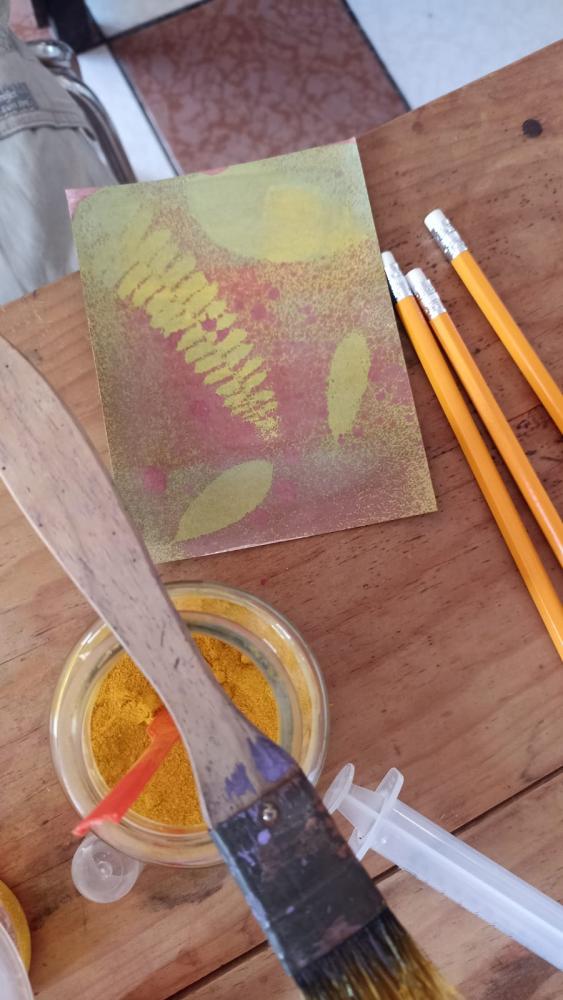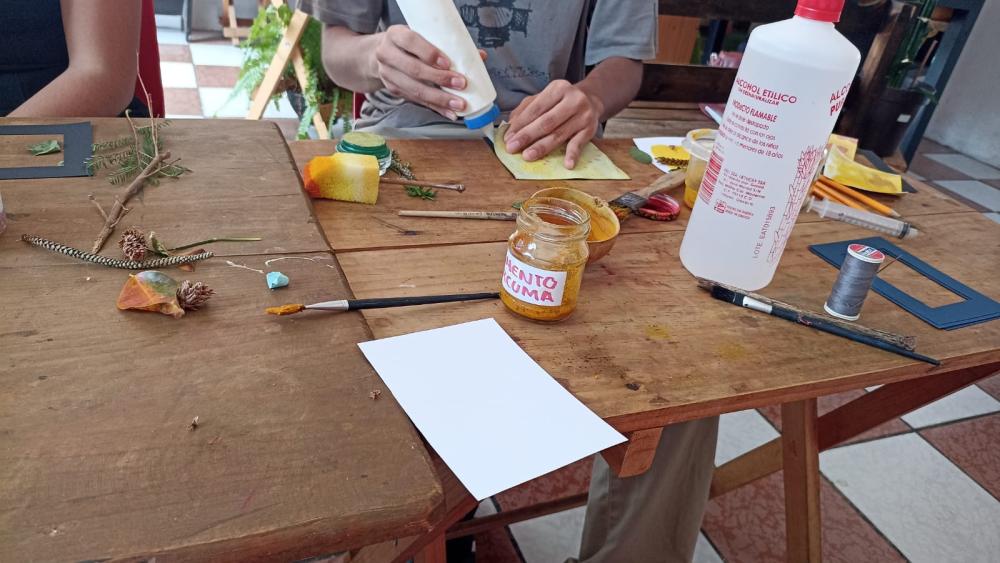Materiales: Polvo de cúrcuma, flores de jamaica secas, pinceles, esponjas, vasos transparentes para revolver, palos para mezclar y triturar, alcohol etílico, tabla de madera, vidrio o portaretratos, pinzas, marcos de cartulina, fichas de papel, pegamento blanco, bicarbonato, ramas y hojas, y una mesa de trabajo (otros materiales se pueden sumar al momento del taller).